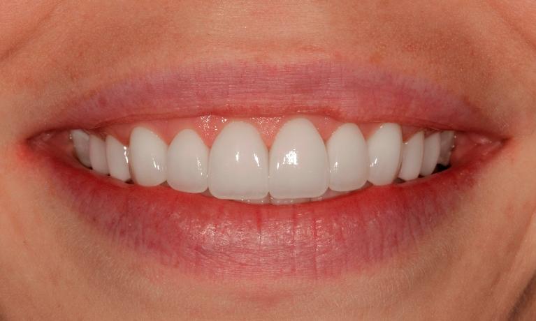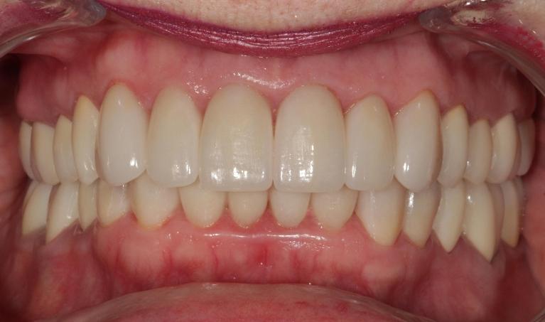 With her full mouth smile makeover we were able to gain better lip support, harmony of her new teeth with her smile line and a more ideal, comfortable, balanced bite.