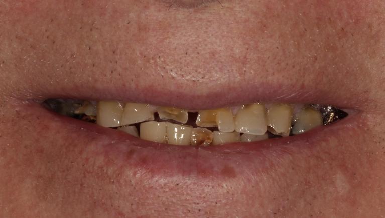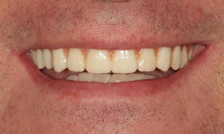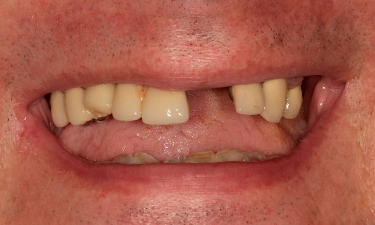 Dave came to us with multiple missing, broken and failing teeth. The old, fractured bridge and now missing tooth made him hide his smile. Many treatment options were available for Dave and together we decided on an all implant supported bridge.